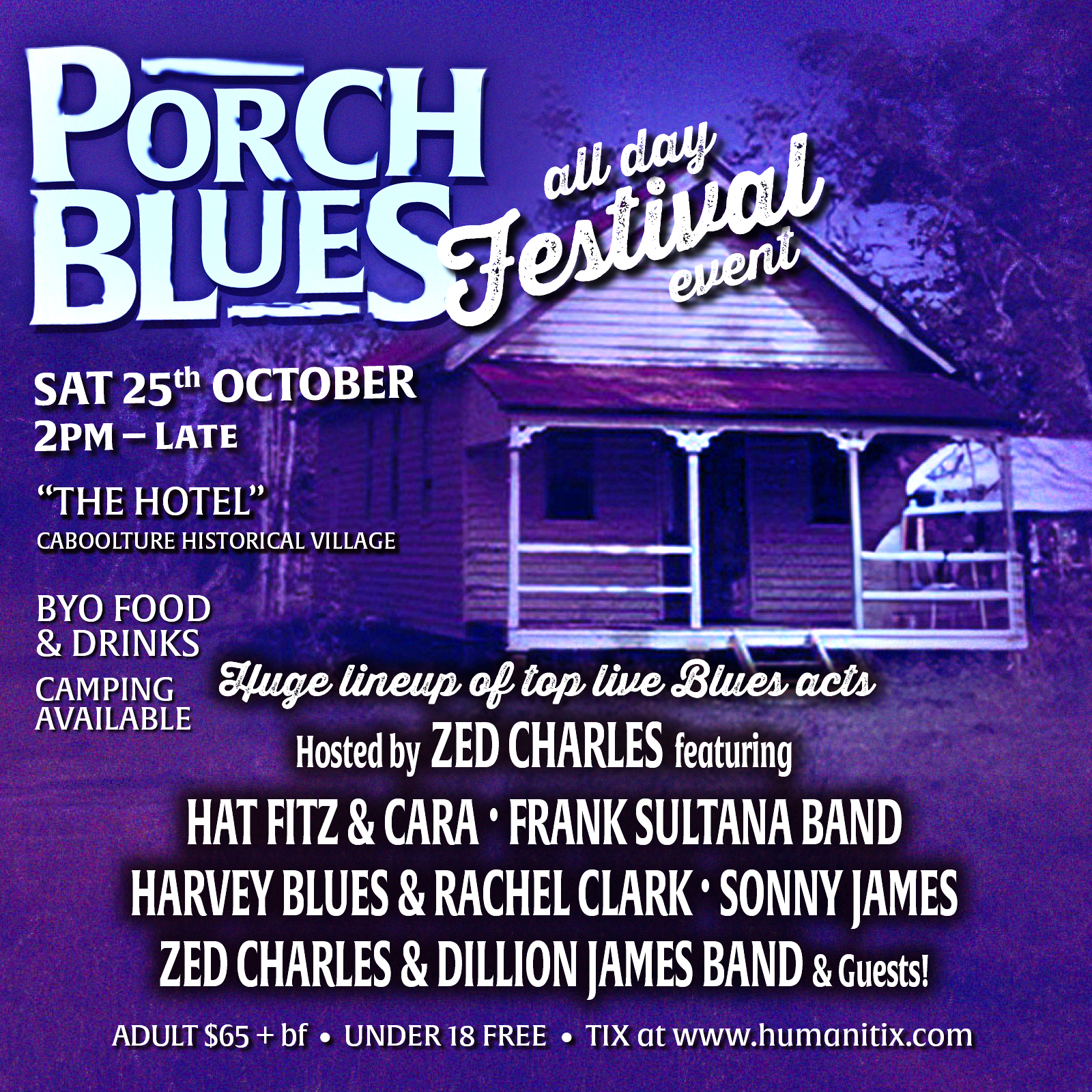 After a series of 8 fabulous Porch Blues events, your host ZED CHARLES presents PORCH BLUES FESTIVAL – an exciting all-day lineup of live music with top, diverse blues artists, featuring: