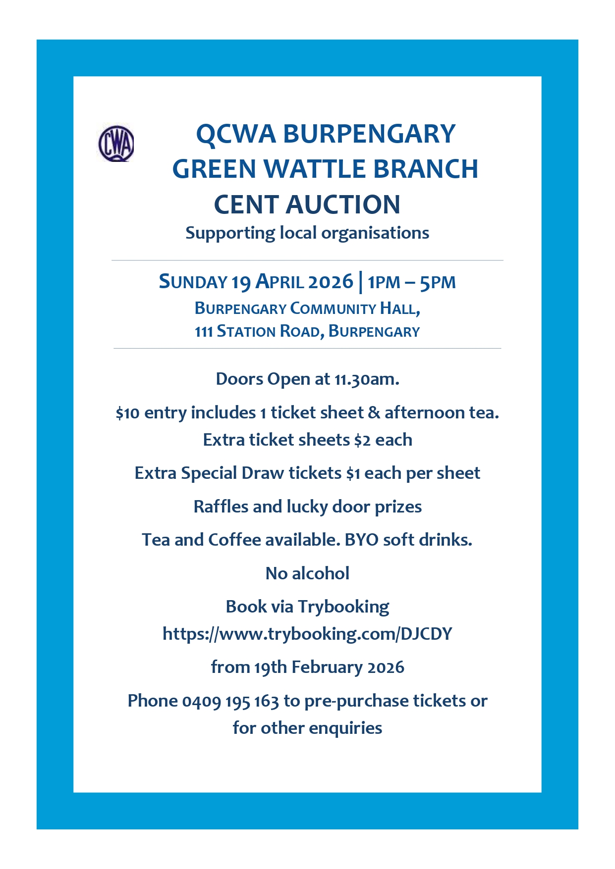 QCWA Burpengary Green Wattles Cent Auction to be held on 19th April 2026 at the Burpengary Community Centre. Doors open at 11.30am