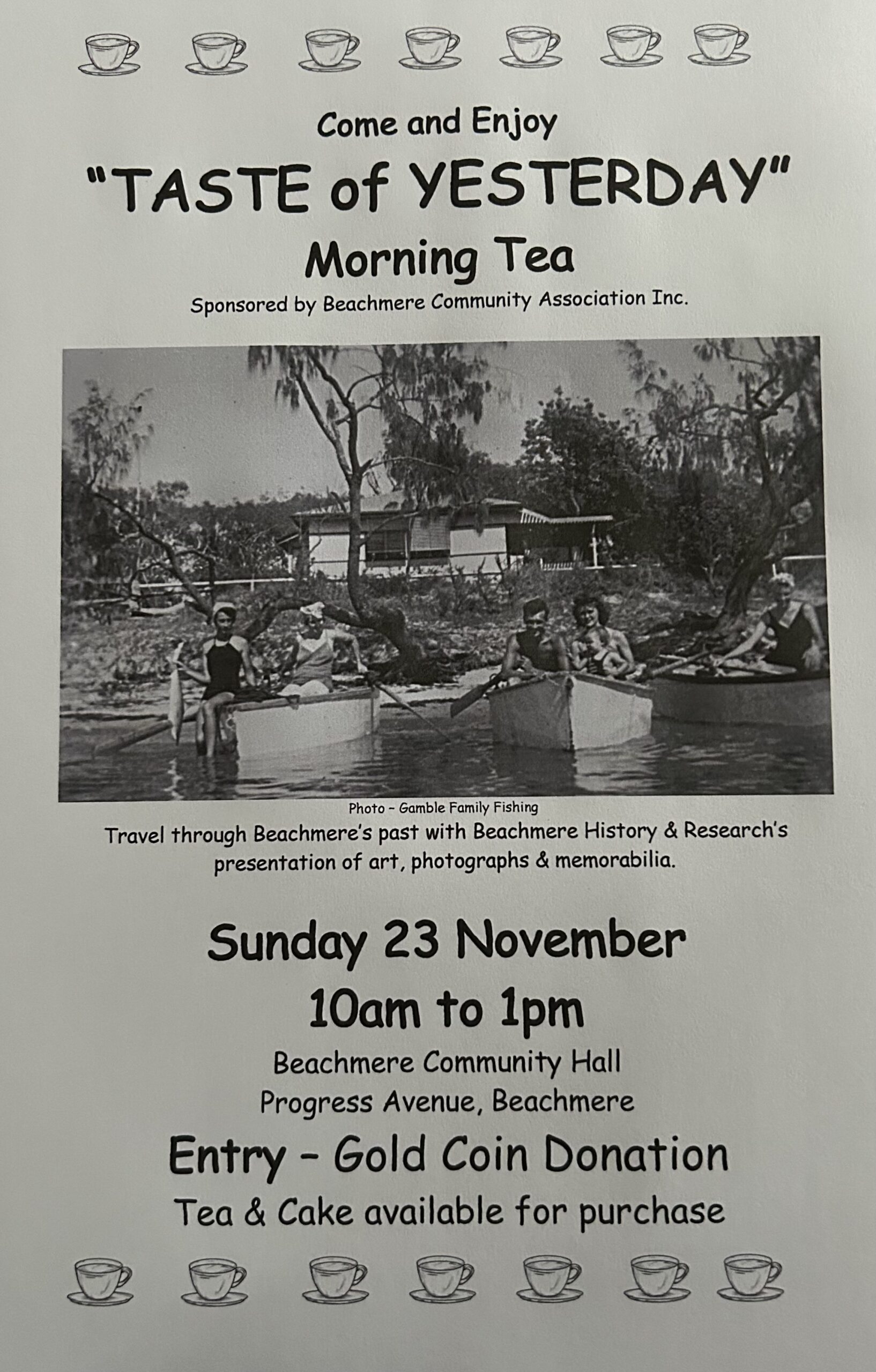 Beachmere Community Hall 5 Progress Avenue, Beachmere, Queensland, AustraliaA Taste of Yesterday a simple morning tea at Beachmere with a bang ! 23 November A simple morning tea provided by the Beachmere Community Association along with some art, photos and memorabilia collected by Beachmere History & Research. Yes See Photos and memorabilia with Art that has been carefully curated to showcase the rich…