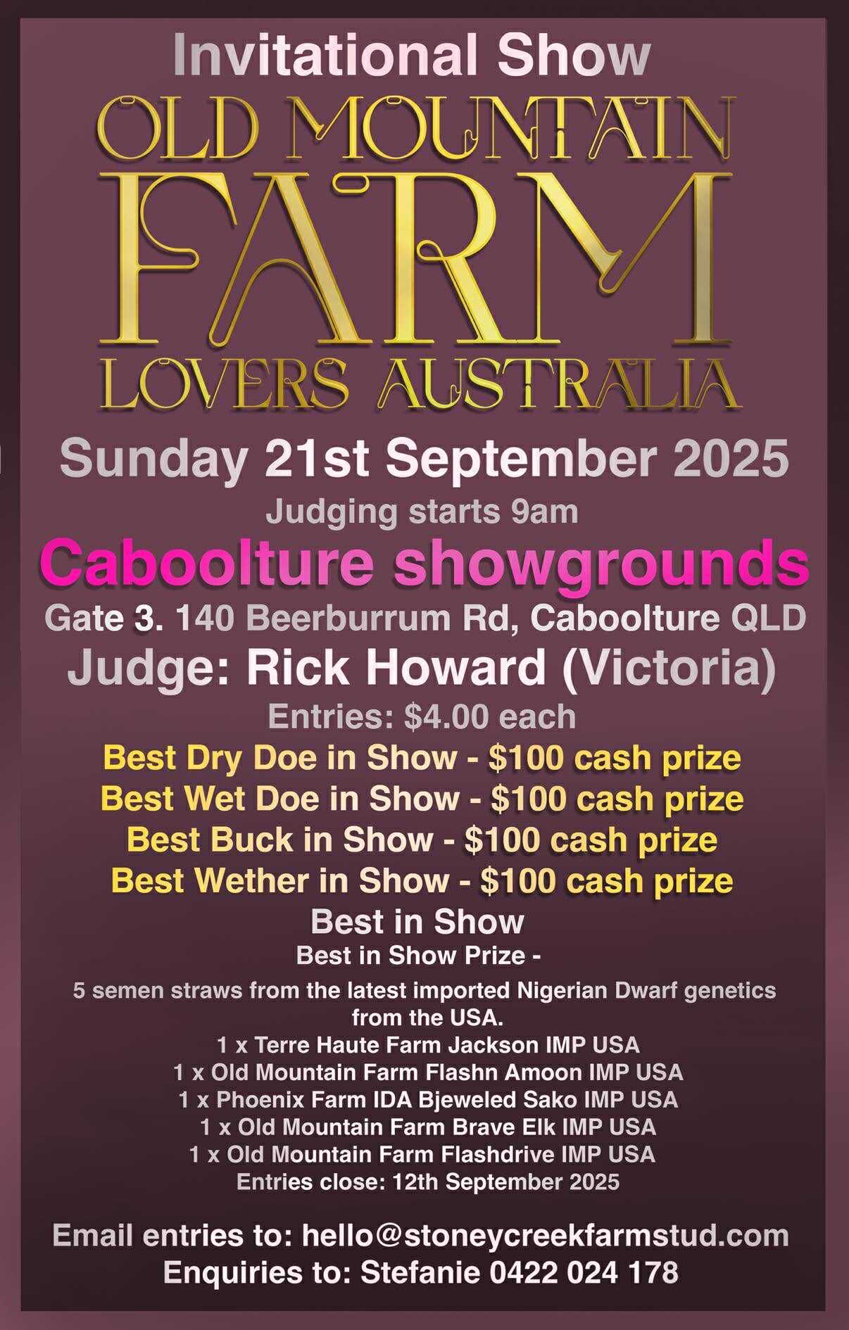 We will be at the Caboolture showground on Sunday 21st September in the undercover Arena. You can see the world class Old Mountain Farm Nigerian Dwarf Goats being judged by Rick Howard. We will have baby goats on display. Nigerian Dwarf goats have exceptional milk quality and are friendly, small and easy to handle. They…