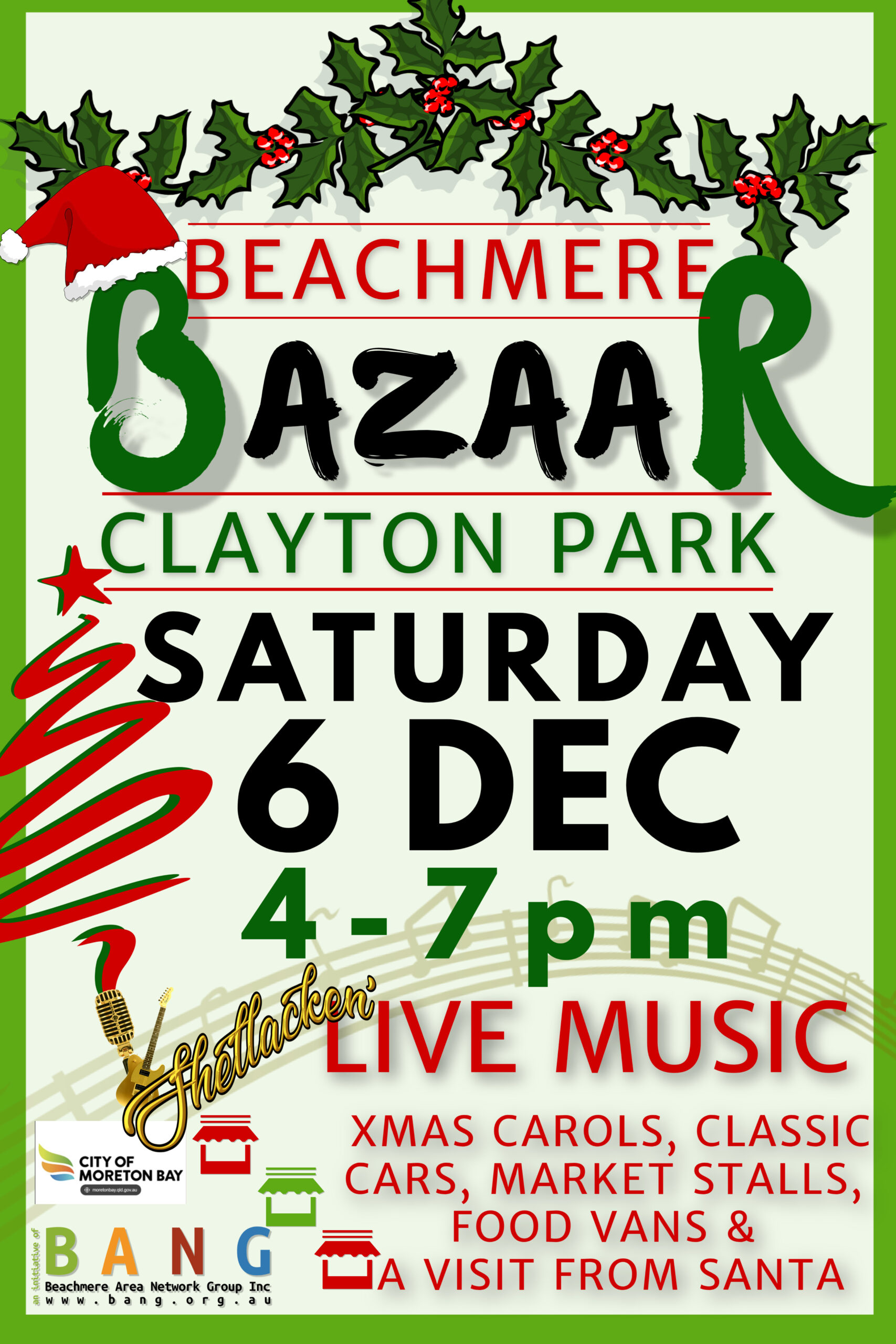 Clayton Park - Beachmere 10-26 Biggs Ave, Beachmere, Queensland, AustraliaBANG! Beachmere Xmas Bazaar & Community Carols Saturday, 6 December Celebrate the Festive Season with Beachmere at the Beachmere Xmas Bazaar & Community Carols. Shellacken and Kiani will entertain with family favourites and carols while you wander our market stalls from local artists, artisans and producers. Beachmere Classic Vehicle Club will keep the engines…