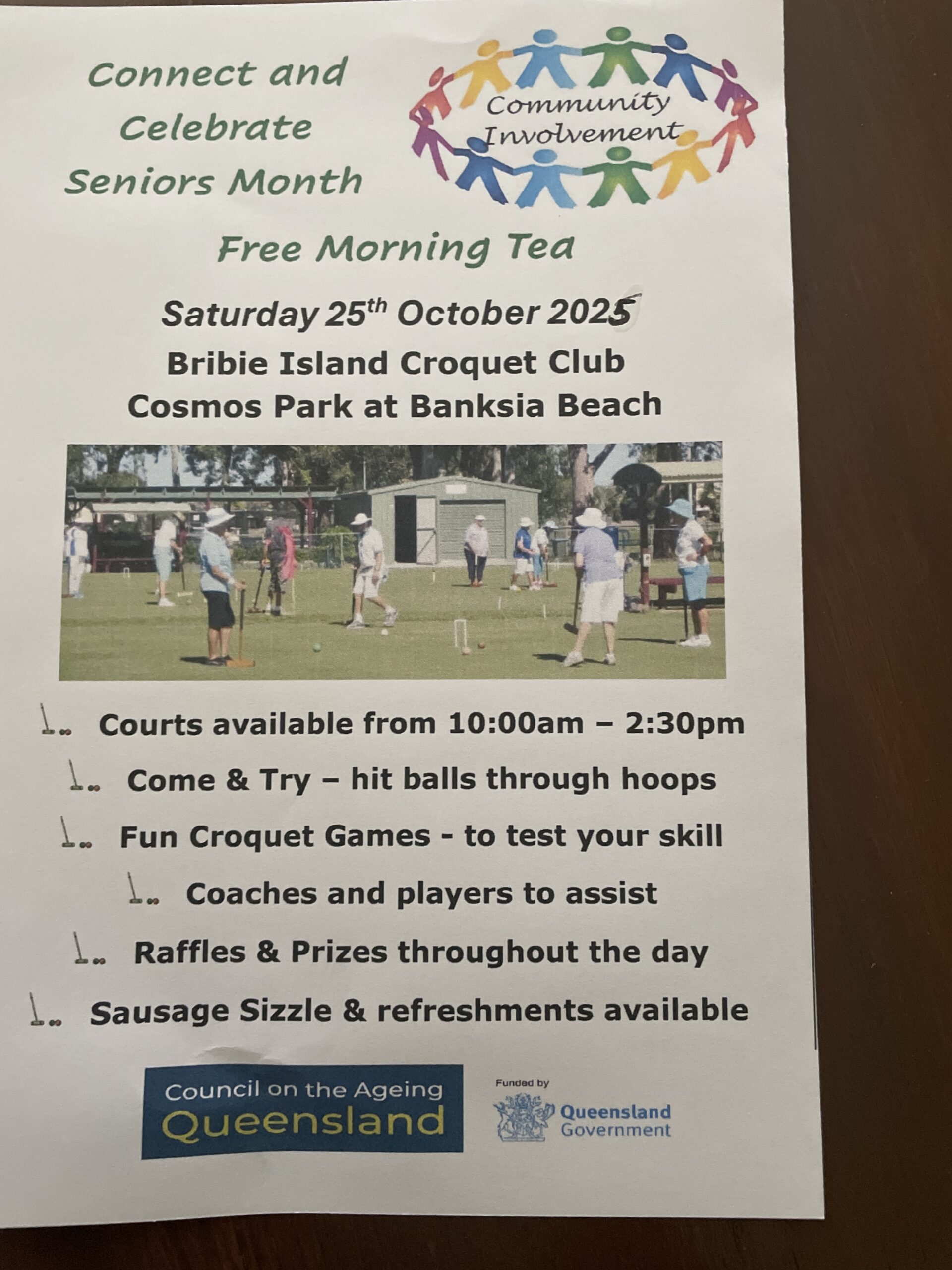 Cosmos Park Sports Complex 70 Sunderland Drive, Banksia Beach, Queensland, AustraliaConnect and celebrate Seniors Month at Banksia Beach 25 October Bribie Island Croquet club is celebrating Seniors Month on Saturday 25 October 10am to 2.30pm. FREE morning tea, try croquet with free coaching. fun croquet games. Raffles and prizes throughout the day. sausage sizzle and refreshments for sale. Contact Person: Lynn Kruger Phone: 0416194078…